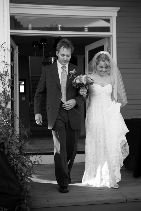 Finally, let’s look at our subjects’ faces. They tell us all that we need to know about the emotions of the day. Our bride is happy and excited, but also appears to be a little nervous. Probably because she is about to step off the deck, but on some level, she may be realizing that the next time she walks through that door, she will be a different person. And what about dad? To me, he looks happy and sad. As a father of two daughters, I can certainly understand.